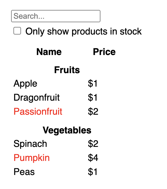 function ProductCategoryRow({ category }) { return ( <tr> <th colSpan="2"> {category} </th> </tr> ); } function ProductRow({ product }) { const name = product.stocked ? product.name : <span style={{ color: 'red' }}> {product.name} </span>; return ( <tr> <td>{name}</td> <td>{product.price}</td> </tr> ); } function ProductTable({ products }) { const rows = []; let lastCategory = null; products.forEach((product) => { if (product.category !== lastCategory) { rows.push( <ProductCategoryRow category={product.category} key={product.category} /> ); } rows.push( <ProductRow product={product} key={product.name} /> ); lastCategory = product.category; }); return ( <table> <thead> <tr> <th>Name</th> <th>Price</th> </tr> </thead> <tbody>{rows}</tbody> </table> ); } function SearchBar() { return ( <form> <input type="text" placeholder="Search..." /> <label> <input type="checkbox" /> {' '} Only show products in stock </label> </form> ); } function FilterableProductTable({ products }) { return ( <div> <SearchBar /> <ProductTable products={products} /> </div> ); } const PRODUCTS = [ {category: "Fruits", price: "$1", stocked: true, name: "Apple"}, {category: "Fruits", price: "$1", stocked: true, name: "Dragonfruit"}, {category: "Fruits", price: "$2", stocked: false, name: "Passionfruit"}, {category: "Vegetables", price: "$2", stocked: true, name: "Spinach"}, {category: "Vegetables", price: "$4", stocked: false, name: "Pumpkin"}, {category: "Vegetables", price: "$1", stocked: true, name: "Peas"} ]; export default function App() { return <FilterableProductTable products={PRODUCTS} />; }